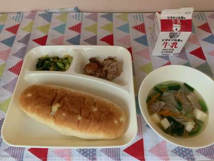 今日の給食は、鶏肉のオイスターソース焼き、中華スープ、チンゲンサイとコーンの中華あえ、おさつパン、牛乳でした。