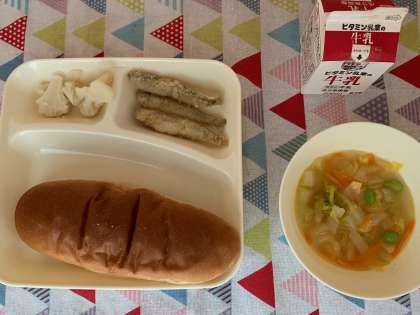 今日の給食は、わかさぎフライ、はくさいのスープ、カリフラワーのサラダ、黒糖パン、牛乳でした。
