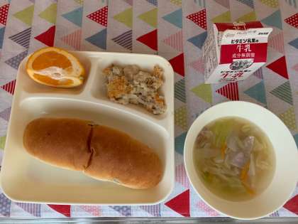 今日の給食は、押麦のグラタン、スープ、いよかん、レーズンパン、牛乳でした。