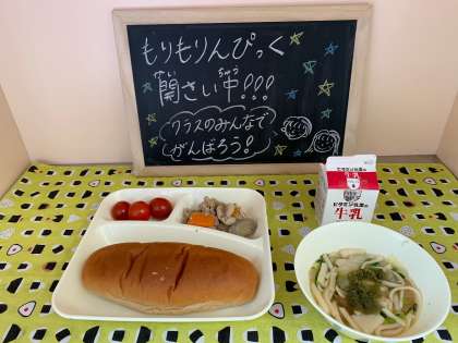 今日から1週間今年度最後のもりもりんぴっくを開催します。今回は、おかず、ごはん、パン、全て食べられているかどうかをみます。初日からどのクラスも協力して頑張っていました!
