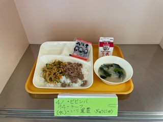 4月14日(水)の給食は、「ビビンバ、トック、いり黒豆、牛乳」です。