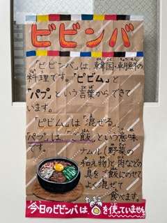 春と冬の年に2回登場するビビンバは、子どもたちにとても好評な献立です。春のビビンバは、だいこんやほうれん草などの冬野菜を使うことができないので、切り干しだいこんやきゅうりを使います。