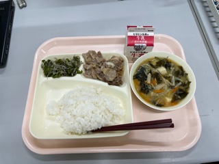 4月16日(金)の給食は、「豚肉のしょうが焼き・みそ汁・じゃこピーマン・ごはん・牛乳」です。