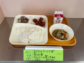 4月19日(月)の給食は、「まぐろのオーロラ煮・含め煮・キャベツの赤じそあえ・ごはん・牛乳」です。