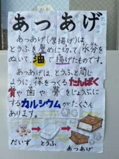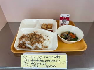 4月21日(水)の給食は、「鶏肉とじゃがいもの煮もの・あつあげのしょうゆだれかけ・紅ざけそぼろ・ごはん・牛乳」です。