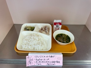 4月26日(月)の給食は、「鶏肉のからあげ・中華スープ・チンゲンサイともやしの甘酢あえ・ごはん・牛乳」です。