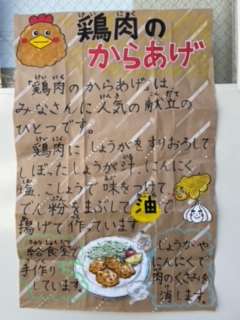 鶏肉のからあげは、子どもたちに人気の献立のひとつで、給食室で手作りしています。しょうが汁、にんにく、しお、こしょうで下味をつけて、でん粉(片栗粉)をまぶして油で揚げています。