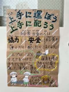 給食は、生きた教材です。日々の献立には、指導のねらいがあります。今日の献立の指導のねらいは、「給食運搬・配膳時の注意」です。