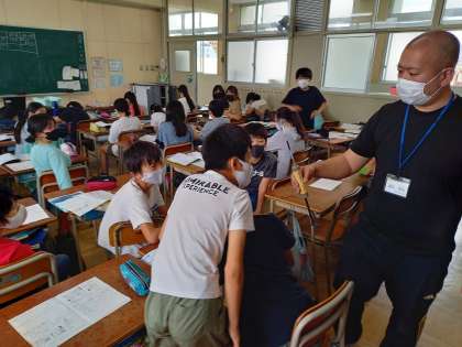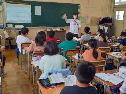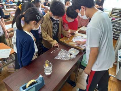 現在、子どもたちが実験を行うことは控えていますが、教室の前で担任の先生が示範実験を行ってくれています。