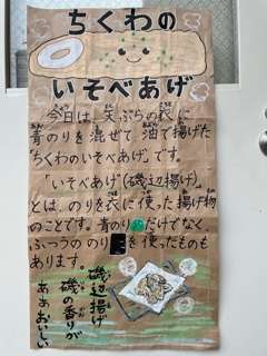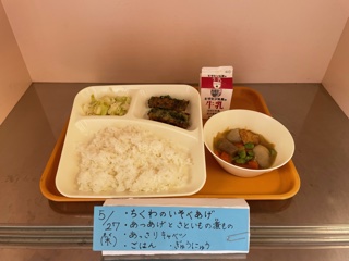 5月27日(木)今日の給食は「ちくわのいそべあげ・あつあげとさといもの煮もの・あっさりキャベツ・ごはん・牛乳」です。