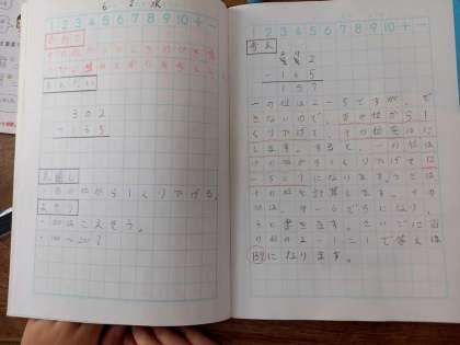 今日は、十の位が0で、くり下げられないときの筆算の学習をしました。
