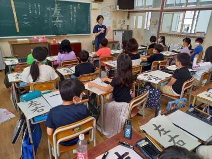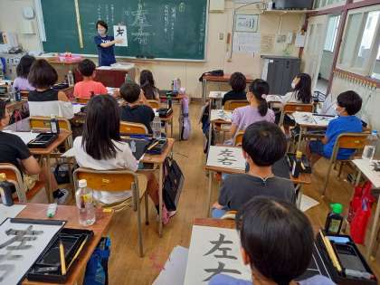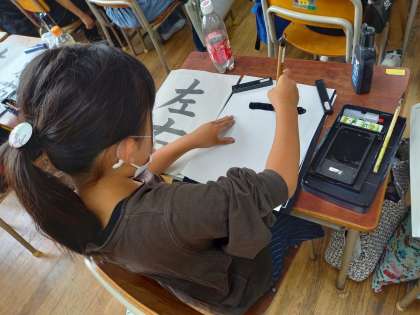 習字の学習(4年) (6月3日) 公開日 2021/06/03 更新日 2021/06/03 お知らせ 通常授業が再開されてから、各学年でか「習字」の授業も始まっています。 4年生は「左右」の2文字を書きます。 「左」「右」両方の文字に「とめ」や「はらい」の要素が含まれており、筆順や字形に気をつけながら練習をしていきます。 いいね(0)