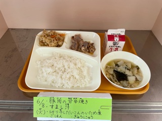 6月8日(火)今日の給食は、「豚肉の甘辛焼き・すまし汁・切干しだいこんのいため煮・ごはん・牛乳」です。