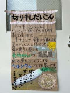 干すことでうま味と栄養が増します。生のだいこんとゆでた切干しだいこんを比べると食物繊維(約2.6倍)やカルシウム(約2.5倍)、鉄(約2倍)などが多くなります。子どもたちにぜひとも食べてほしい食材です。