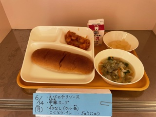 6月14日(月)今日の給食は、「えびのチリソース・中華スープ・和なし(カット缶)・黒糖パン・牛乳」です。