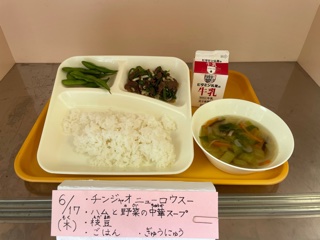 6月17日(木)今日の給食は、「チンジャオニューロウスー・ハムと野菜の中華スープ・枝豆・ごはん・牛乳」です。