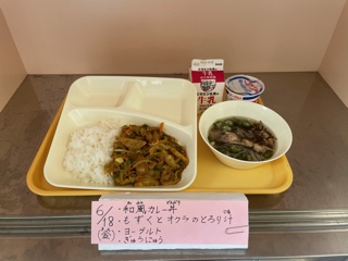 6月18日(金)今日の給食は、「和風カレー丼・もずくとオクラのとろり汁・ヨーグルト・牛乳」です。