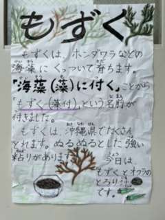 もずくは糸状の海藻です。ホンダワラなどの海藻に付いて育ちます。「藻(も)に付く」ことから「もずく(藻付)」と名付けられたそうです。