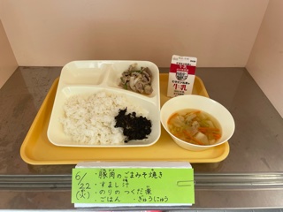 6月22日(火)今日の給食は「豚肉のごまみそ焼き・すまし汁・のりのつくだ煮・ごはん・牛乳」です。