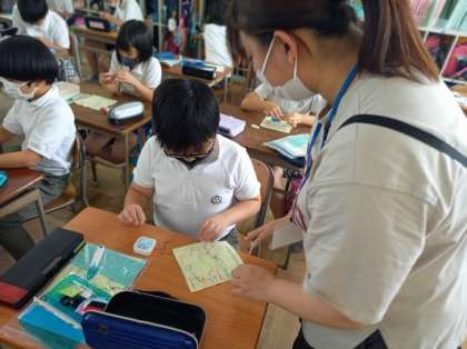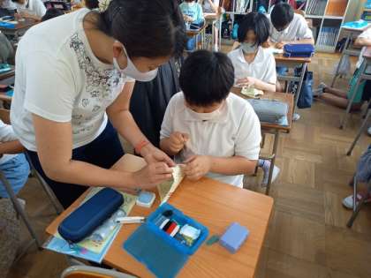 子どもたちの学習支援が必要な時にかけつけてくださる地域やPTAのボランティアのみなさんで、困っている子どもたちにてきぱきと声をかけていただき、「玉結び」「玉どめ」のやり方、コツなどを丁寧に教えていただきました。