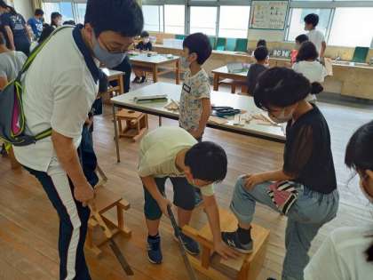 これまで、のこぎりや金づちを使った経験のある子は少なく、初めはぎこちない動きも目立ちましたが、先生にポイントを教えてもらいながら制作を進めていくうちに、徐々にコツがつかめてきたようで、熱心に板を切ったり、くぎ打ちをしたりしていました。
