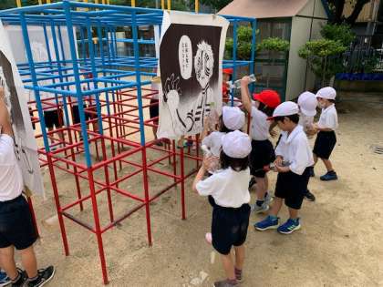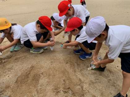 なつがやってきた!(1年生活科) (7月2日) 公開日 2021/07/02 更新日 2021/07/02 お知らせ 1年生は生活科で、“なつのあそび”について学習しています。 身近にあるものを利用して、土や水なども使いながら楽しめる遊びについて考えます。 今日はペットボトルに水を入れ、1年生全員で“水あそび”です! “まとあて”“どろあそび”“おにあそび”の3つのコーナーをつくり、水の入ったペットボトルを手に、子どもたちはあそびに夢中!楽しい楽しい時間を過ごしました! いいね(0)