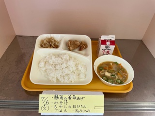 7月6日(火)今日の給食は、「豚肉の香味あげ・みそ汁・もやしのおひたし・ごはん・牛乳」です。