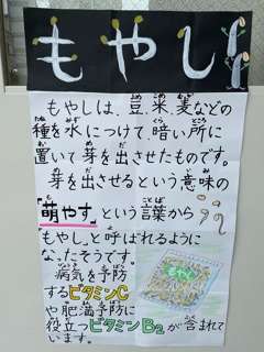 もやしのおひたしは、砂糖とこいくちしょうゆで作った調味液をゆでたもやしにかけています。さっぱりとした味わいで子どもたちに好評でした。