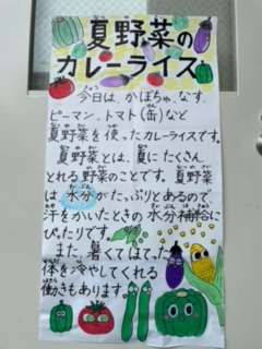 7月8日(木)今日の給食は、「夏野菜のカレーライス・キャベツのサラダ・冷とうみかん・牛乳」です。