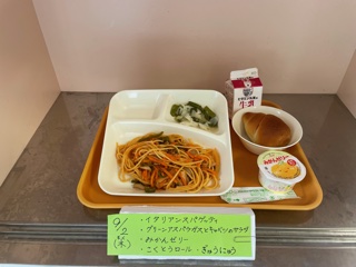 9月2日(木)今日の給食は、「イタリアンスパゲッティ・グリーンアスパラガスとキャベツのサラダ・みかんゼリー・黒糖ロールパン・牛乳」です。