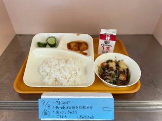 9月3日(金)今日の給食は、「肉じゃが・あつあげのみそだれかけ・あっさりきゅうり・ごはん・牛乳」です。