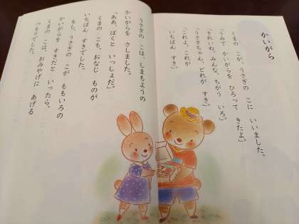 くまの子は、「ももいろ」の貝がらをうさぎの子にあげようと思っていましたが、うさぎの子は、くまの子もお気に入りの「しまもよう」の貝がらが好き、と答えます。
