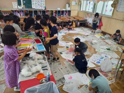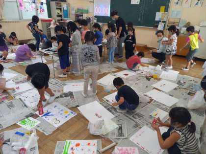 うつした かたちから(1年図画工作) (9月14日) 公開日 2021/09/14 更新日 2021/09/14 お知らせ 1年生の図画工作は「うつした かたちから」の学習です。 お家から持ってきた空き容器や野菜のへた、綿などを使って、その切り口や側面などに絵の具をつけて、それを大きな画用紙に “ぺたっ”! スタンプを押すように、画用紙に様々な形の模様をつけていき、自分の考えた作品を表現していきます。 その様子はまさに芸術家! 楽しい作品が次々と出来上がっていきました! いいね(0)
