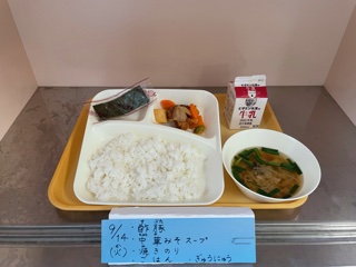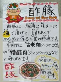 9月14日(火)、今日の給食は「酢豚・中華みそスープ・焼きのり・ごはん・牛乳」です。