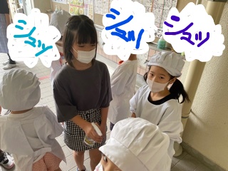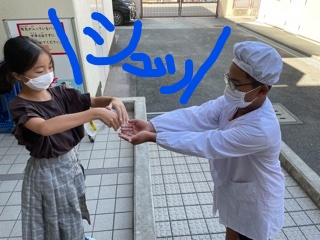 4時間目が終わり、給食時間が始まると、毎日、保健委員会の子どもたちが給食室前で、給食当番の手指の消毒をします。ていねいに手を洗い、順番に並び、「シュッ❕」