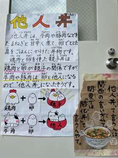 鶏肉と卵の「親子丼」は、鶏肉と卵が親子関係ですが、牛肉と卵は親子でない、他人なので「他人丼」と名付けた関西らしい発想(わかりやすい!)が名前の由来です。