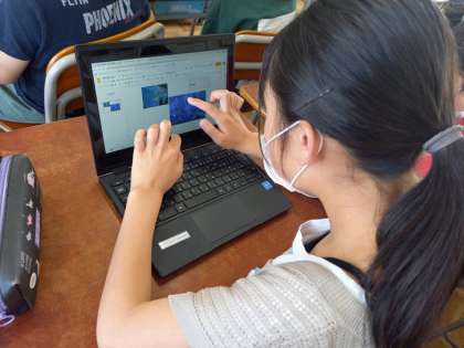 旅行先である伊勢・信楽方面のことを事前学習として調べ、それらを端末を使ってスライドショーにして入力、編集していきます。