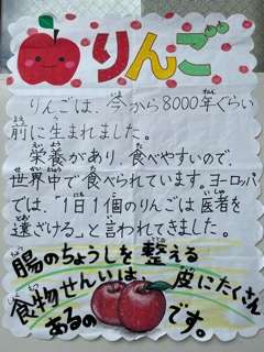 今日は、季節の果物がデザートにつきました。りんごは、リンゴ酸やクエン酸などが含まれ疲労回復に役立ちます。また、皮の部分に多く含まれる食物せんいは、整腸作用、コレステロールの吸収抑制効果が期待できます。