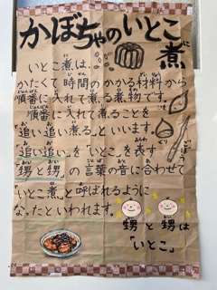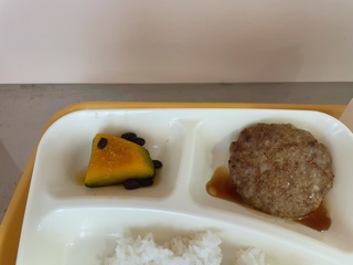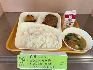 10月14日(木)、今日の給食は「和風ハンバーグ・とうふのみそ汁・かぼちゃのいとこ煮・ごはん・牛乳」です。