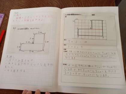 研究授業(4年算数) (10月15日) 公開日 2021/10/15 更新日 2021/10/15 お知らせ 今日は4年生(2組)で研究授業が行われました。 L字型などの複合図形を分割したり、補完したりして、面積を出していきます。 いずれの場合も、「線を入れて」考えるということが大切になってきます。 いいね(0)