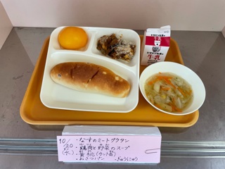 10月20日(水)、今日の給食は「なすのミートグラタン・鶏肉と野菜のスープ・黄桃(缶)・おさつパン・牛乳」です。
