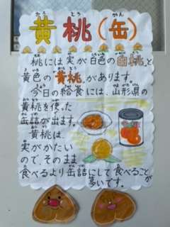 今日の給食の黄桃の缶詰は、山形県産の黄桃を2つ割りにして、シロップ漬けにしたものです。