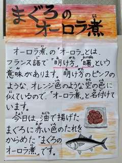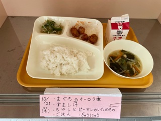 10月21日(木)、今日の給食は「まぐろのオーロラ煮・すまし汁・もやしとピーマンのいためもの・ごはん・牛乳」です。