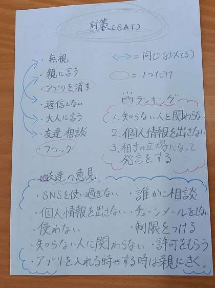 そして、班で「SNSでトラブルにあわない作戦“ベスト3”」を話し合って発表し、クラス全体でスマートフォンやSNSの利用について考えていきます。