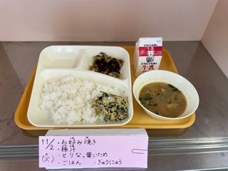 11月2日(火)、今日の給食は「お好み焼き・豚汁・とりなっ葉いため・ごはん・牛乳」です。