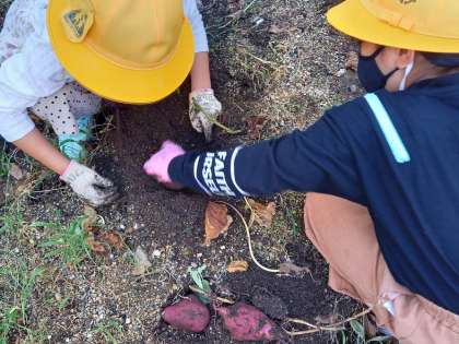しっかりと伸びた“つる”を取った後、スコップや手で土を掘り起こしていきます。