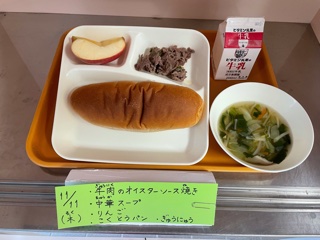 11月11日(木)、今日の給食は「牛肉のオイスターソース焼き・中華スープ・りんご・黒糖パン・牛乳」です。