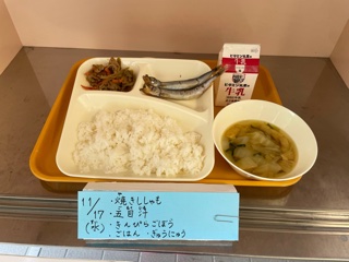 11月17日(水)、今日の給食は「焼きししゃも・五目汁・きんぴらごぼう・ごはん・牛乳」です。