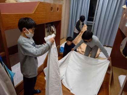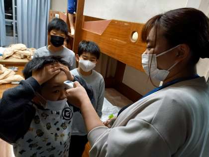朝の用意や検温、布団の片付けをしています。