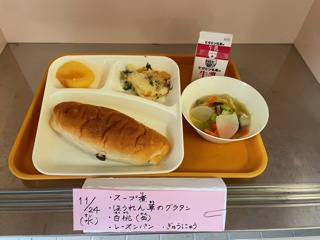 11月24日(水)、今日の給食は「スープ煮・ほうれんそうのグラタン・白桃(缶)・レーズンパン・牛乳」です。